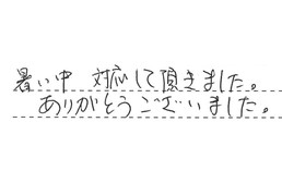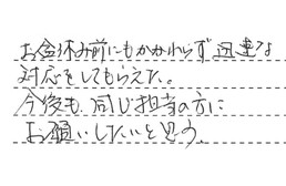 お盆休み前にもかかわらず、迅速な対応をしてもらえた。今後も同じ担当の方にお願いしたいと思う。