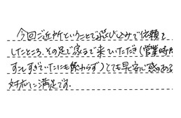 今回ご近所ということで、飛び込みで依頼をしたところ、その足で家まで来ていただき(営業時間をすぎていたにも係わらず)とても早く安心感のある対応に満足です。