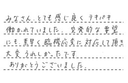 みなさんとても感じ良く、テキパキと働かれていました。突発的な要望にも、素早く臨機応変に対応して頂き、大変うれしかったです。ありがとうございました。