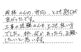 岡林さんの対応、とても感じが良かったです。工事の近藤さんも、とても良い方でした。また何かあったら、お願いしたいと思います。