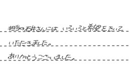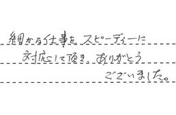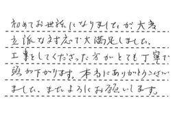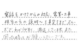 初めてお世話になりましたが、大変立派な対応で、大満足しました。工事をしてくださった方がとても丁寧で、頭が下がります。本当にありがとうございました。またよろしくお願いします。