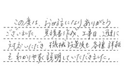 この度は、お世話になり、ありがとうございました。見積書作成、工事日、迅速に対応いただき、機械設置後も、各種詳細をわかりやすく説明していただきました。