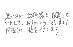 暑いなか、給湯器を設置していただき、ありがとうございました。問題なく使用できてます。