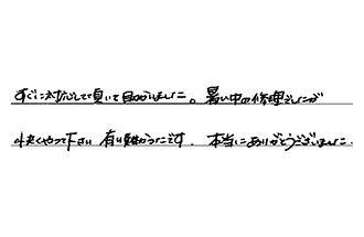 すぐに対応して頂いて助かりました。暑い中の修理でしたが、快くやって下さり、有り難かったです。本当にありがとうございました。