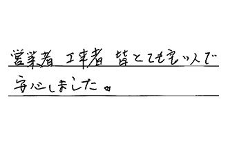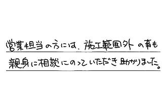 営業担当の方には、施工範囲外の事も親身に相談にのっていただき、助かりました。