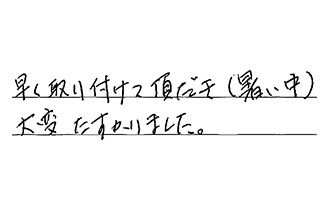 早く取り付けて頂き(暑い中)、大変たすかりました。