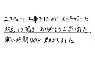 エコキュート工事でしたが、スピーディーに対応して頂き、ありがとうございました。寒い時期なので助かりました。