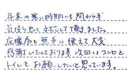 年末の寒い時期にも関わらず、気持ち良く対応して頂きました。床暖房も無事に使えて、大変感謝いたしております。次回はコンロとトイレをお願いしたいと思っています。