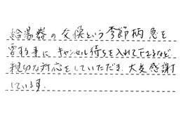 給湯器の交換という季節柄急を要する事に、キャンセル待ちを入れて下さるなど、親切な対応をしていただき、大変感謝しています。