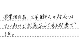 営業担当者、工事職人の対応は、ていねいで礼儀正しく、好印象でした。
