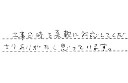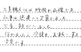 工事職人さんは、時間が正確で、仕事は迅速かつ丁寧であった。大変親切であった。何かあったら、今後もお願いする予定です。
