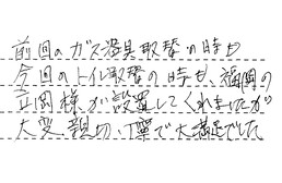 前回のガス器具取替の時も、今回のトイレ取替の時も、福岡の立岡様が設置してくれましたが、大変親切・丁寧で、大満足でした。