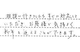 相談に行きましたら、すぐに対応していただき、お蔭様で気持よく新年を迎えることができます。