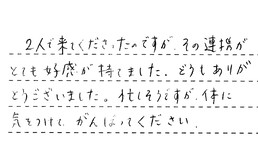 2人で来てくださったのですが、その連携がとても好感が持てました。どうもありがとうございました。忙しそうですが、体に気をつけて、がんばってください。