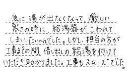 急に湯が出なくなって、厳しい寒さの時に、給湯器がこわれてしまい、たいへんでした。しかし、担当の方が工事までの間、貸し出しの給湯器を付けていただき、助かりました。工事もスムーズでした。