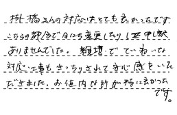 掛橋さんの対応は、とても良かったです。こちらの都合で日にち変更したり、申し訳ありませんでした。親切でていねいな対応、工事もきっちりされて、安心感をいただきました。お値打ちな所が特に良かったです。