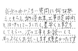 当方のわからない質問に、何でも答えてもらえ、納得出来、工事日程時間もはっきりしていましたし、素早く工事完了してもらい、次の工事もお願いしてあり、よろしくお願いします。大変良かったです。