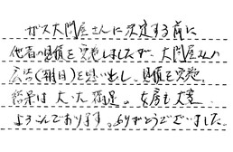 ガス大問屋さんに決定する前に、他社の見積を実施しましたが、大問屋さんの広告(朝日)を思い出し、見積を実施、結果は大・大満足。女房も大変よろこんでおります。ありがとうございました。