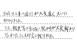 取付け工事の進行が大変速く、大いに助かりました。また、機具等の取扱い説明が大変解り易かったことも印象に残りました。