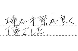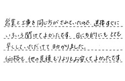 営業と工事を同じ方がされていたので、直接すぐにいろいろ聞けてよかったです。日にち的にもとても早くしていただけて、助かりました。価格も他の見積もりよりもお安くて、よかったです。
