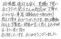 給湯器、値段も安く、見積り、下見に来て下さった兒玉さんの対応が丁寧で、わからない事等(排気カバーの取り付け)教えて頂き、ありがたかったです。また工事後の対応も、言葉遣い、態度がすごく良く、おだやかで良い方に来て頂き、感謝しています。ありがとうございました。