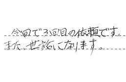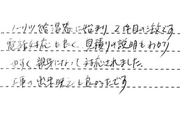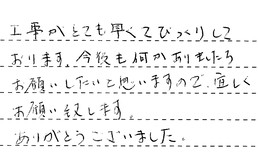 工事がとても早くて、びっくりしております。今後も何かありましたら、お願いしたいと思いますので、宜しくお願い致します。ありがとうございました。