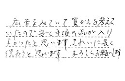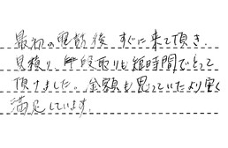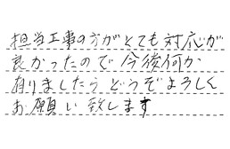 最初の電話後、すぐに来て頂き、見積り、段取りも短時間でとって頂けました。金額も思っていたより安く、満足しています。