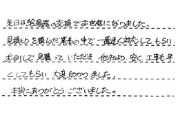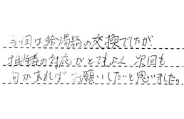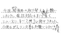 先日は給湯器の交換でお世話になりました。見積もりを頼んだ業者の中で、一番速く対応してもらい、お急ぎで見積っていただき、他社より安く、工事も早くしてもらい、大変助かりました。本当にありがとうございました。