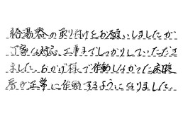 給湯器の取り付けをお願いしましたが、丁寧な対応・工事までしっかりしていただきました。おかげ様で、作動しなかった床暖房が、正常に作動するようになりました。