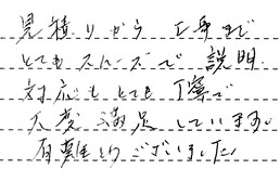見積りから工事まで、とてもスムーズで、説明・対応もとても丁寧で、大変満足しています。有難うございました。