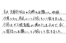 先日、洗面台蛇口の交換をお願いし、価格、作業ともに満足のいく対応をして頂きました。今回は、ガス給湯器が壊れてしまったので、すぐに御社にお願いして、対応して頂きました。