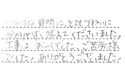 いろいろな質問にとても丁ねいに分かりやすく答えてくださいました。工事はお一人でした。ご苦労様でした。ありがとうございました。