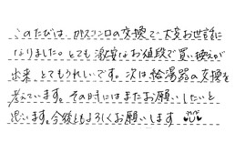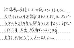給湯器の対応でお世話になりました。老朽化により不調をきたしておりましたが、当方の日的的な制約にも快くご対応くださり、大変感謝しております。どうもありがとうございました。