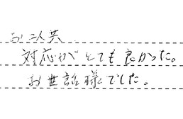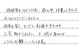 説明等もわかりやすく、雨の中、作業して下さって、ありがとうございました。値段も安く、カードも利用できたので、大変助かりました。又、何か有れば、よろしくお願いいたします。