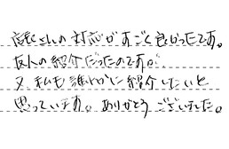 店長さんの対応がすごく良かったです。友人の紹介だったのです。又、私も誰かに紹介したいと思っています。ありがとうございました。