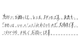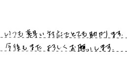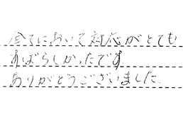 貴社にお願いして、とてもよかったです。友達も「あそこはいいよ。」と言われていたので、大満足です。これからもよろしくお願いします。