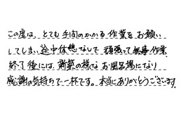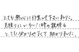 とても熱心に作業して下さいました。見積りにいらした時の説明も、とても分かりやすくて、助かりました。