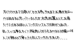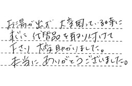 お湯が出ず、大変困っている時に、すぐに代替品を取り付けて下さり、大変助かりました。本当にありがとうございました。