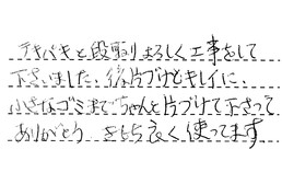 テキパキと段取りよろしく工事をして下さいました。後片づけもキレイに、小さなゴミまでちゃんと片づけてくださって、ありがとう。きもち良く使ってます。
