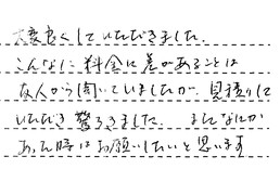 大変良くしていただきました。こんなに料金に差があることは友人から聞いていましたが、見積りしていただき驚きました。またなにかあった時は、お願いしたいと思います。