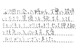 初回に会った時から、丁寧に説明して下さり、見積りも施工も、とてもテキパキとしっかりはっきりやって頂きました。とても気に入っています。大変ありがとうございました。