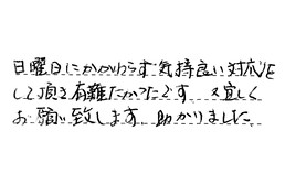 日曜日にかかわらず、気持良い対応をして頂き、有難かったです。又宜しくお願い致します。助かりました。
