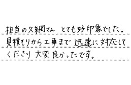 担当の久綱さん、とても好印象でした。見積もりから工事まで、迅速に対応してくださり、大変良かったです。