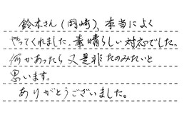 鈴木さん(岡崎)、本当によくやってくれました。素晴らしい対応でした。何かあったら、又是非たのみたいと思います。ありがとうございました。