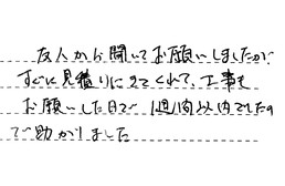 友人から聞いてお願いしましたが、すぐに見積りにきてくれて、工事もお願いした日から1週間以内でしたので、助かりました。