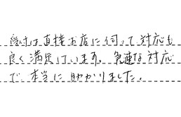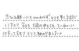 急なお願いにもかかわらず、とても早く対応して下さり、当日も大雨の中、とてもていねいに仕事して下さり、とても助かりました。