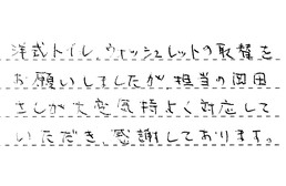 洋式トイレ、ウォシュレットの取替をお願いしましたが、担当の岡田さんが大変気持よく対応していただき、感謝しております。