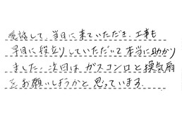 電話して当日に来ていただき、工事も早目に段取りしていただいて、本当に助かりました。次回はガスコンロと換気扇をお願いしようかと思っています。