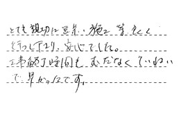 とても親切に営業・施工等良く行って下さり、安心でした。工事終了時間も、むだなくていねいで良かったです。