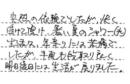 突然の依頼でしたが、快く受けて頂け、暑い夏のシャワー(水)生活は、年寄りには苦痛でしたが、手配も段取り良く、明後日には生活が戻りました。